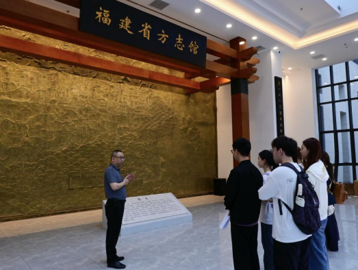 抵达方志馆后,福建省方志馆馆长蔡海山热情接待了师生一行,并为大家作了总体介绍。他首先阐释了不同场馆承载着不同的文化使命,而方志馆的独特职责在于系统收集、整理和保护地方文献,留存八闽大地的历史记忆。蔡馆长还引导大家观看方志馆外墙上镌刻的福建历史地图,以生动的讲解帮助师生们直观感受福建地理沿革与方志文化的深厚底蕴。