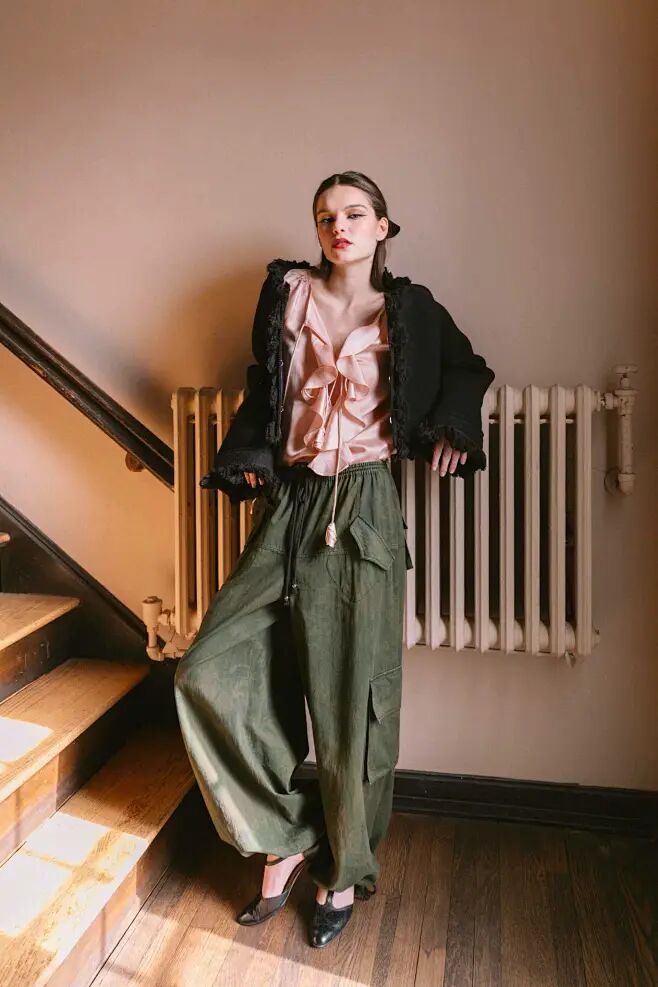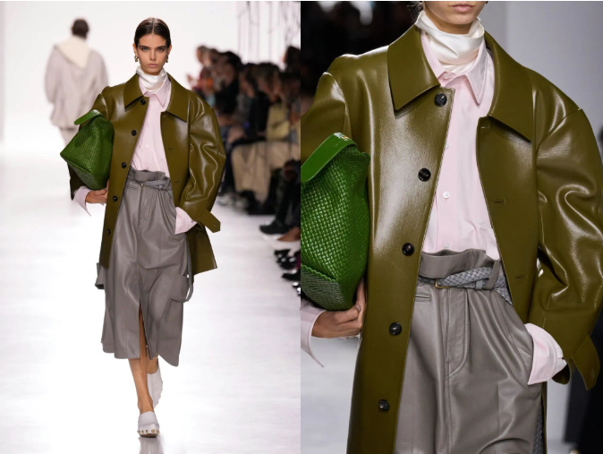 Bottega Veneta 以一件淡粉衬衫为基底,搭配苔藓绿皮衣与草绿色包包,柔软的衬衫中和了皮衣的硬朗,皮革材质则为整体造型注入了细腻质感。