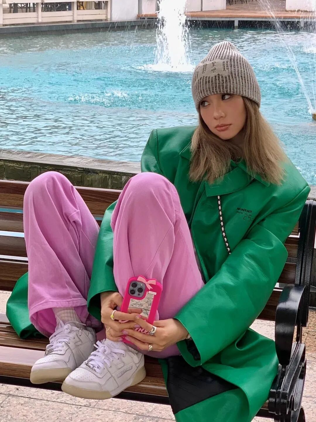 粉色自带柔和、温暖的氛围,能舒缓情绪;绿色则关联自然、生机,像把草地或树叶的清新搬进了穿搭,视觉上很解压。