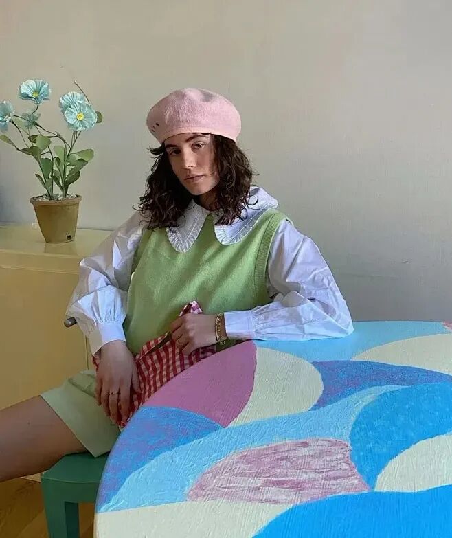 绿色毛衣叠穿白衬衫,再戴一顶粉色贝雷帽点缀,绿色的清新自然与粉色的甜美活泼相互映衬,白衬衫则起到中和与过渡的作用。