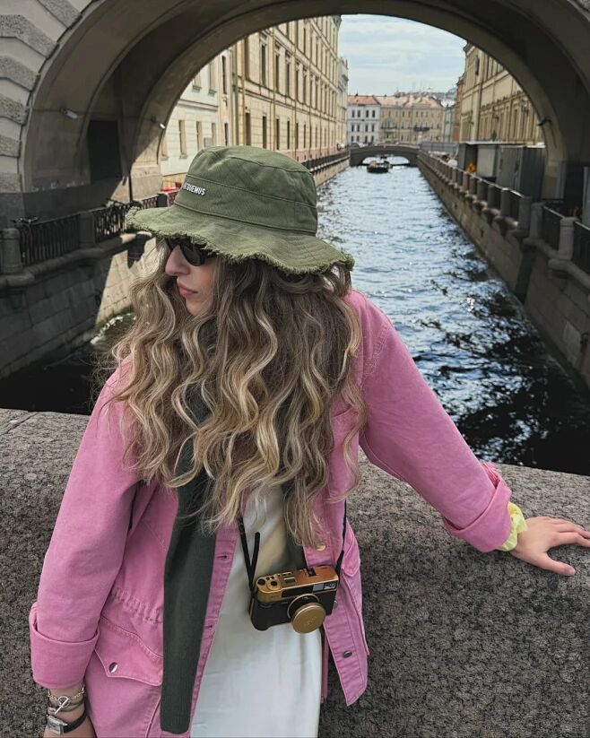 以粉色为主色调时,搭配一顶橄榄绿色渔夫帽撞色,还挺耐看的。