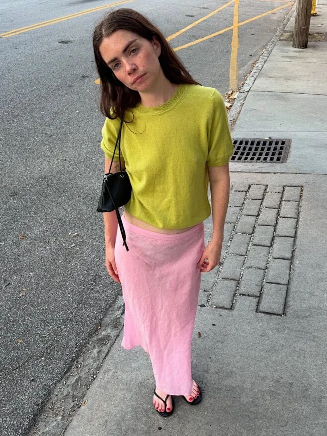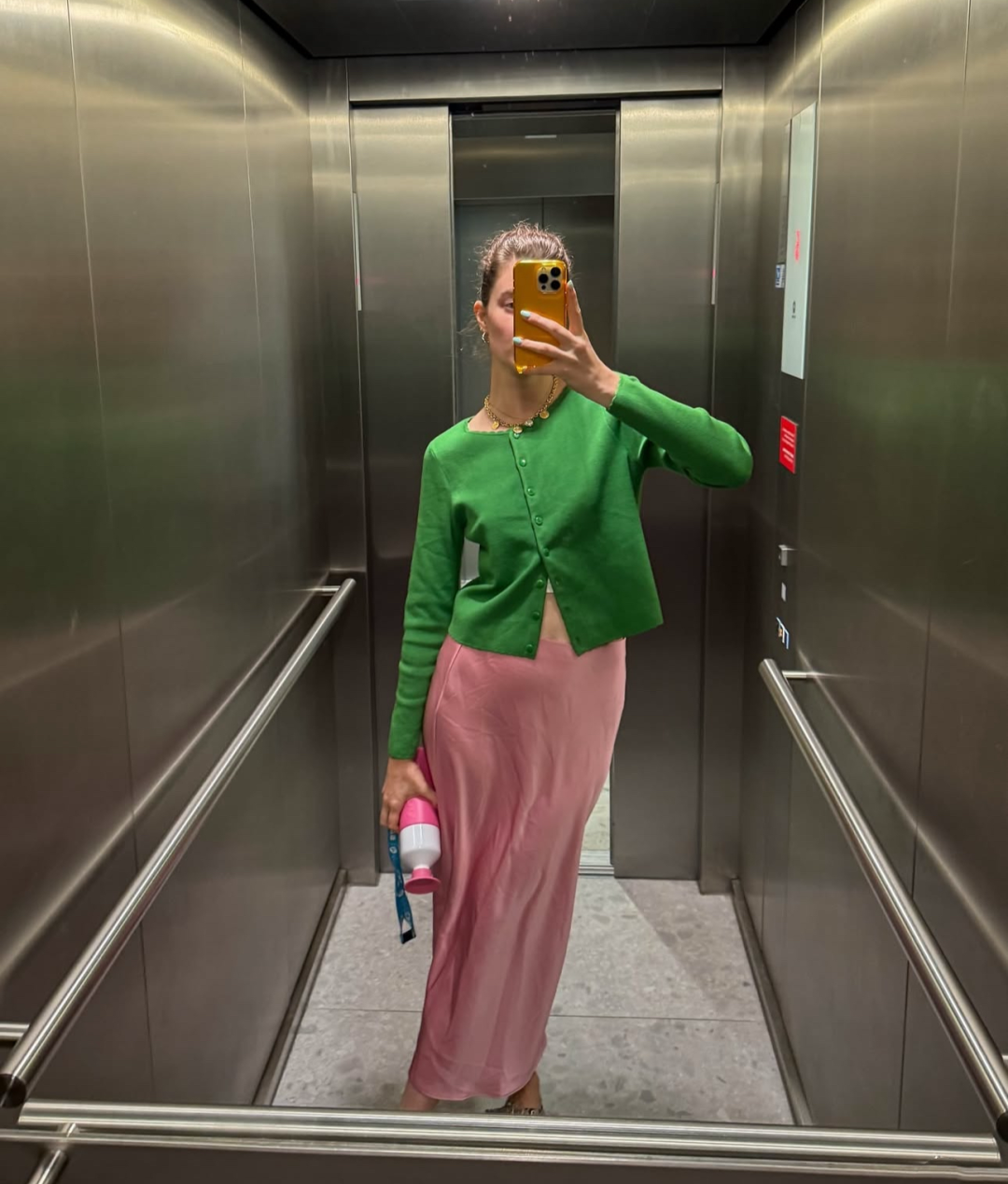 超爱挑战色彩搭配的德国博主 Linda.sza,自然没错过 “粉配绿” 的风潮,用柔和的粉调 polo 衫,搭配清新绿缎面裙,既有 polo 衫的利落休闲,又有缎面裙的丝滑质感,让 “粉配绿” 跳出甜腻,多了份随性酷感。