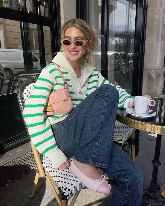 绿色条纹衫搭配粉色小包,粉色小包为造型增添一抹亮色,清新又吸睛。