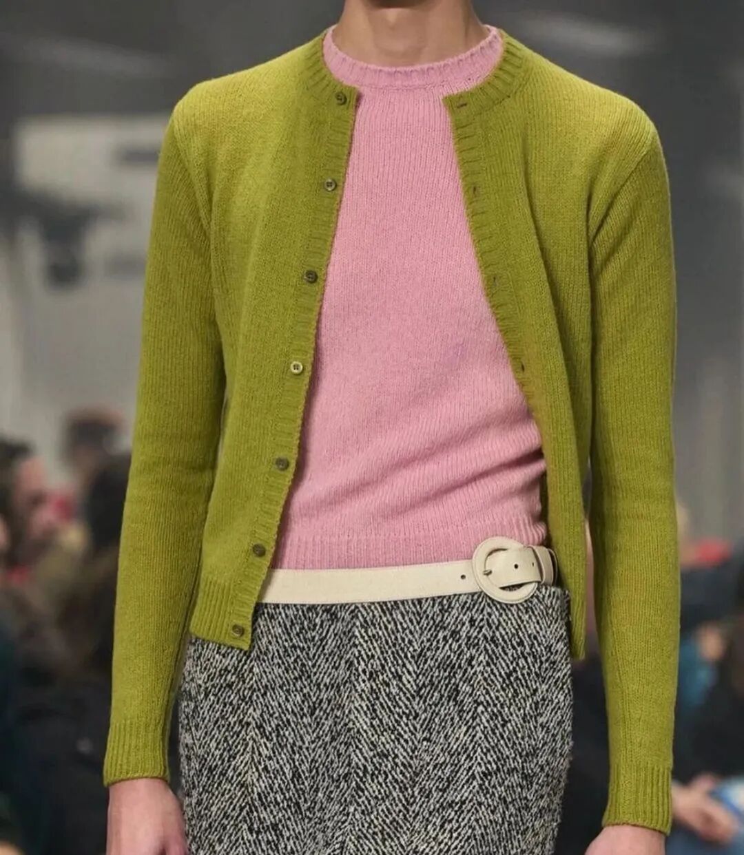 反过来也可以这样搭,选择用绿色针织开衫内搭粉色打底衫。