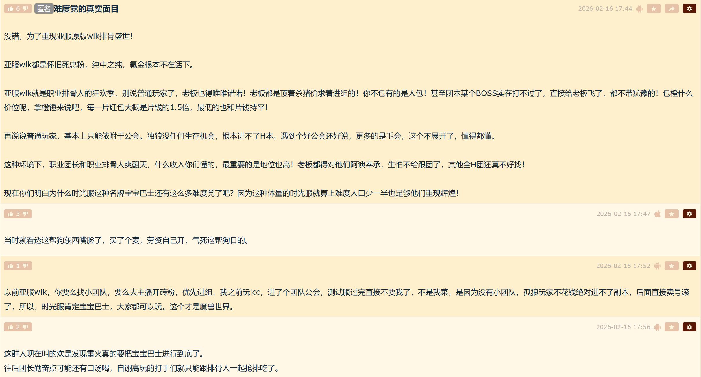 那么现在回归到这个帖子本身。帖子提到了一个问题,大概总结一句话就是大家希望魔兽世界时光服拉高整体团本的难度。而拉高难度的核心意义在于,如果难度拉高,那么就能重现当初WLK“排骨人”的盛世。当然,农工需要补充一点,就是难度不能拉得太高,要让“排骨人”刚刚好可以完成。就像时光服前段时间不是很多玩家吐槽难度过大吗?无非就是因为“排骨人”也过不去,所以只能一起吐槽了。