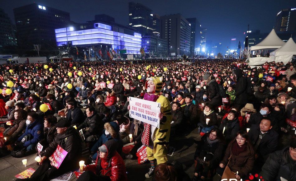 2014年“世越号”沉船事故中,朴槿惠失踪了,她消失的行为暴露了权力系统的溃烂:当300余名学生在冰冷海水中呼救时,总统却在接受崔顺实的“注射美容”。次日,她现身指挥部,念出崔氏代笔的道歉稿,语调机械的念到:“政府未能保护国民安全,深表歉意。”民众的愤怒在那一刻点燃:“她不是总统,是崔顺实的提线木偶!”2016年11月,百万民众连续20周集会,要求朴槿惠下台。学生们举着“世越号亡灵在注视你”的标语。