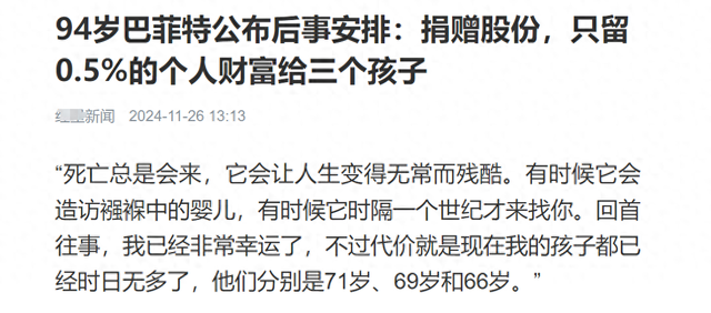 原来,巴老爷子在自知“时日无多”之际,向外界公开了自己的后事安排:只留0.5%的个人财富给三个孩子!