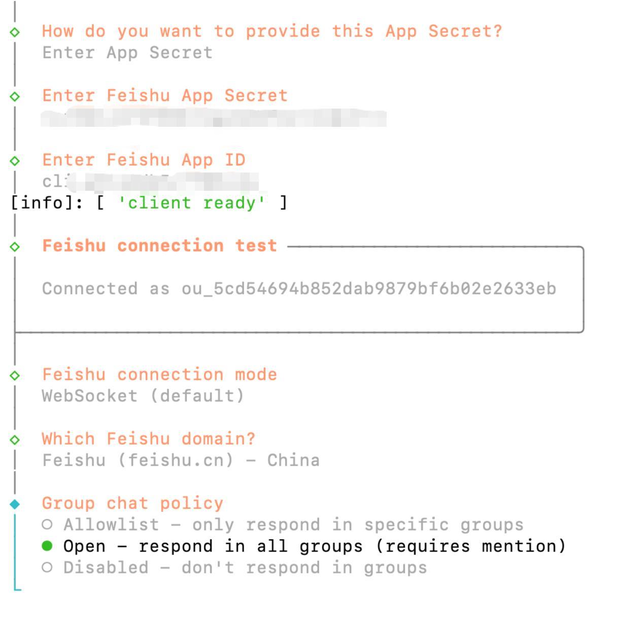 安装完成后,输入飞书应用的 App ID 和 App Secret(前面获取到的)。
