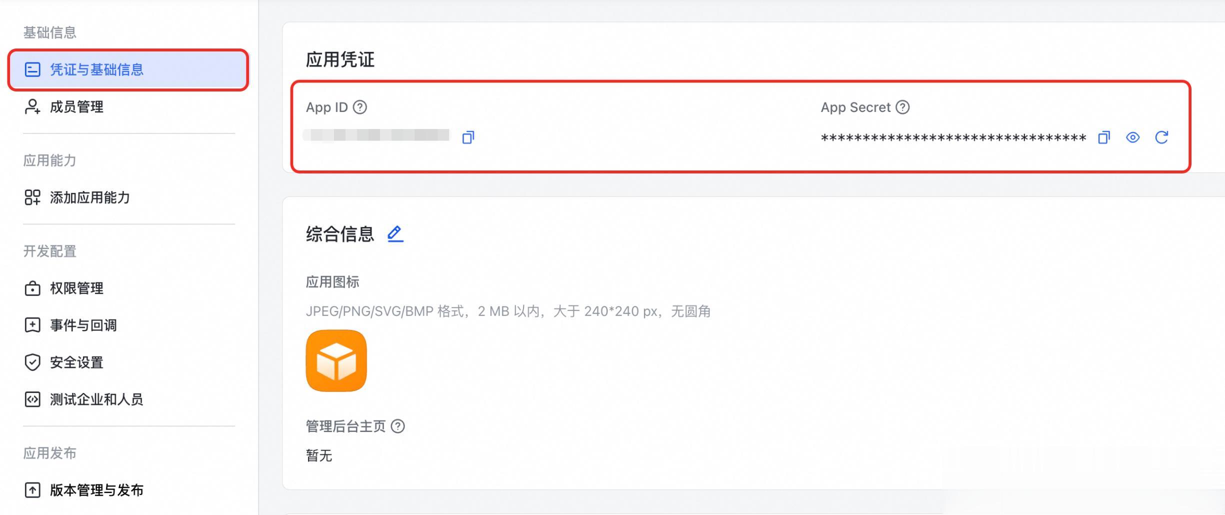 App Secret 是应用的秘钥。在创建应用时,由系统自动生成,在调用某些 API 时,需要将App Secret 作为请求参数之一。用户可以在开发者后台的 凭证与基础信息 页面查询或重置秘钥。