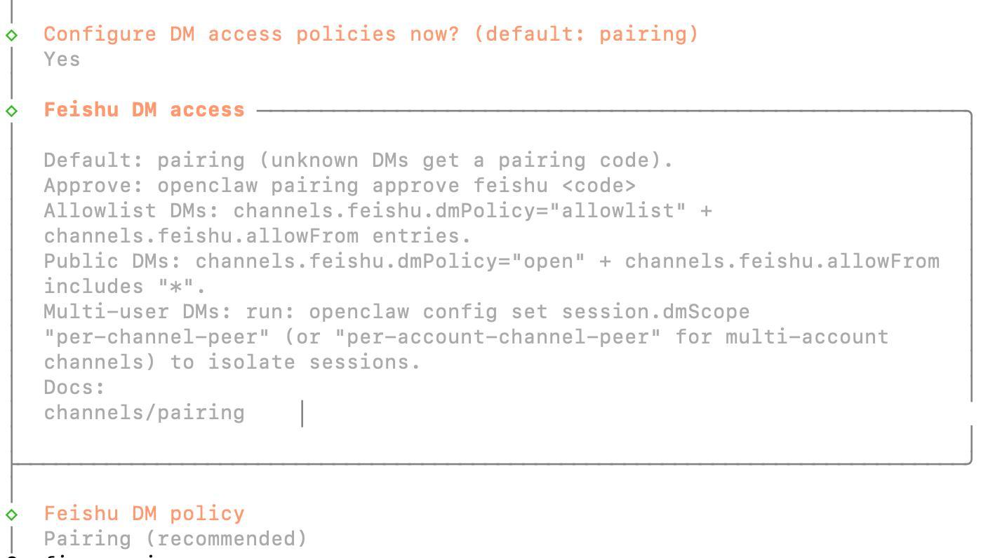 接下来,配置私信访问策略,默认:配对模式。选择 Yes,如图所示。