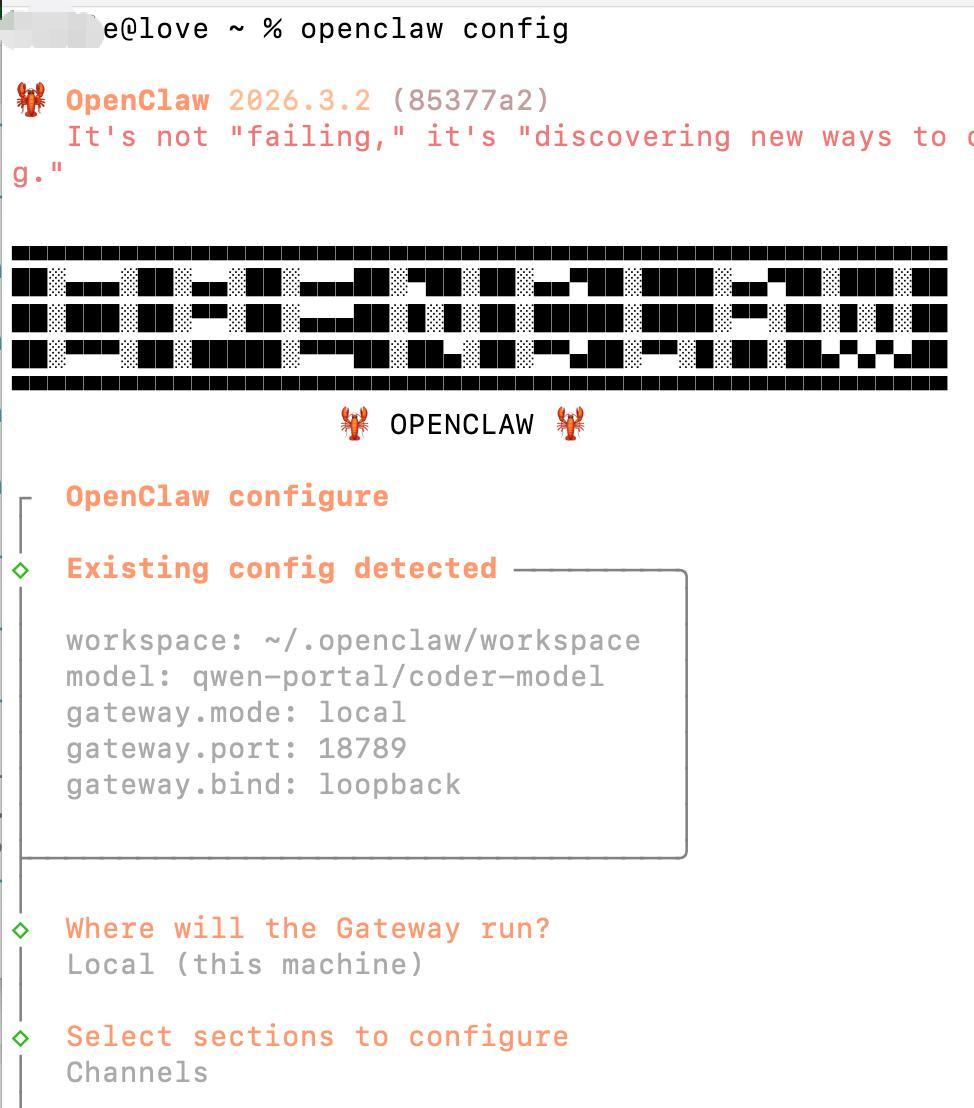 openclaw config可以参考下图进行选择: