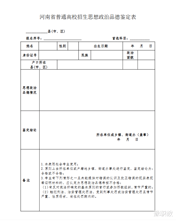 无高中毕业证、中职毕业证参加高考报名考生,特别是往届考生,根据表格内容填写盖章,交于户籍地教育局招生办。