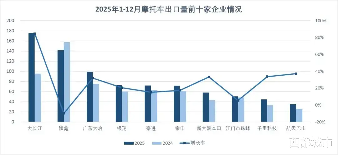 至2025年,全市摩托车产量达785.7万辆,占全国总产量的35.5%;摩托车出口总额264.7亿元,同比增长29.5%,全国出口前十强中渝企占据5席,每三辆走出国门的中国摩托,就有一辆是“重庆造”。