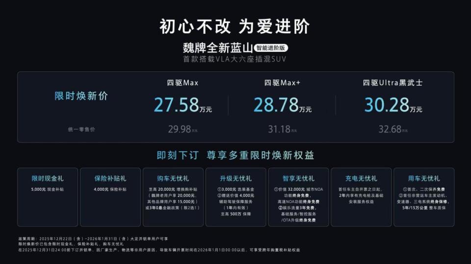 12月22日,当北方的寒风已有些刺骨,魏牌全新蓝山智能进阶版的上市,却给中大型六座混动SUV市场添了一把热乎气。对于关注家用车的消费者来说,蓝山这个名字并不陌生——方正的身形、均衡的三排空间,早已是不少家庭的出行首选。而这一次,它带着VLA大模型和新一代CP Master辅助驾驶系统而来,显然不满足于“实用派”的标签,想在“智能”赛道上再进一步。