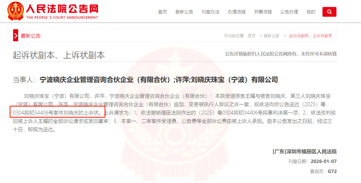 人民法院公告网显示,深圳市福田区人民法院1月7日刊登了刘晓庆的上诉状,上诉请求之一为依法改判驳回被上诉人王先生的全部诉讼请求或发回重审。(新闻报料请私信微信公众号“大河看见”)