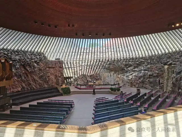 我很喜欢音乐和艺术,去了赫尔辛基的岩石教堂,在那里听了场音乐会。芬兰人非常强调人与自然的关系,这座教堂的内壁,是未经任何修饰的岩石的本来面貌。教堂顶部为圆顶,由 100 条放射状的红铜梁柱支撑,再镶上透明玻璃,阳光穿透进来,有一种非常纯粹的自然美。