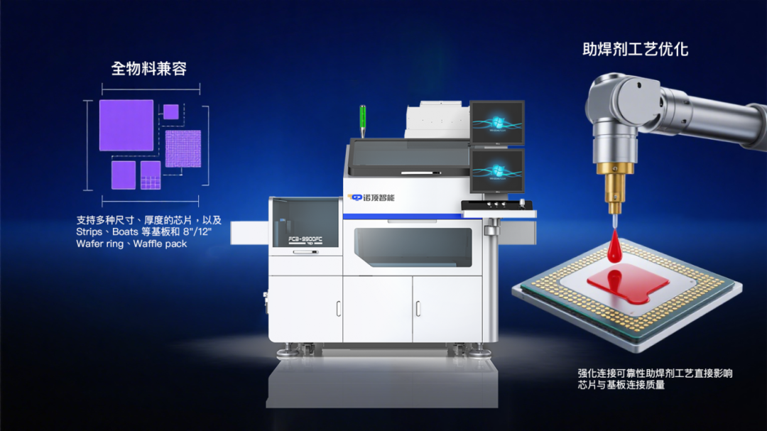 在集成电路封装领域,倒装芯片技术因高效信号传输、紧凑封装尺寸的优势,成为消费电子、高端计算等领域的核心选择。随着大规模倒装回流焊工艺主导市场,对设备 “快、准、灵活” 的需求愈发迫切。诺顶 FCB9900FC 高速倒装芯片固晶设备,以创新技术打破传统局限,成为倒装芯片制造的 “性能标杆”。