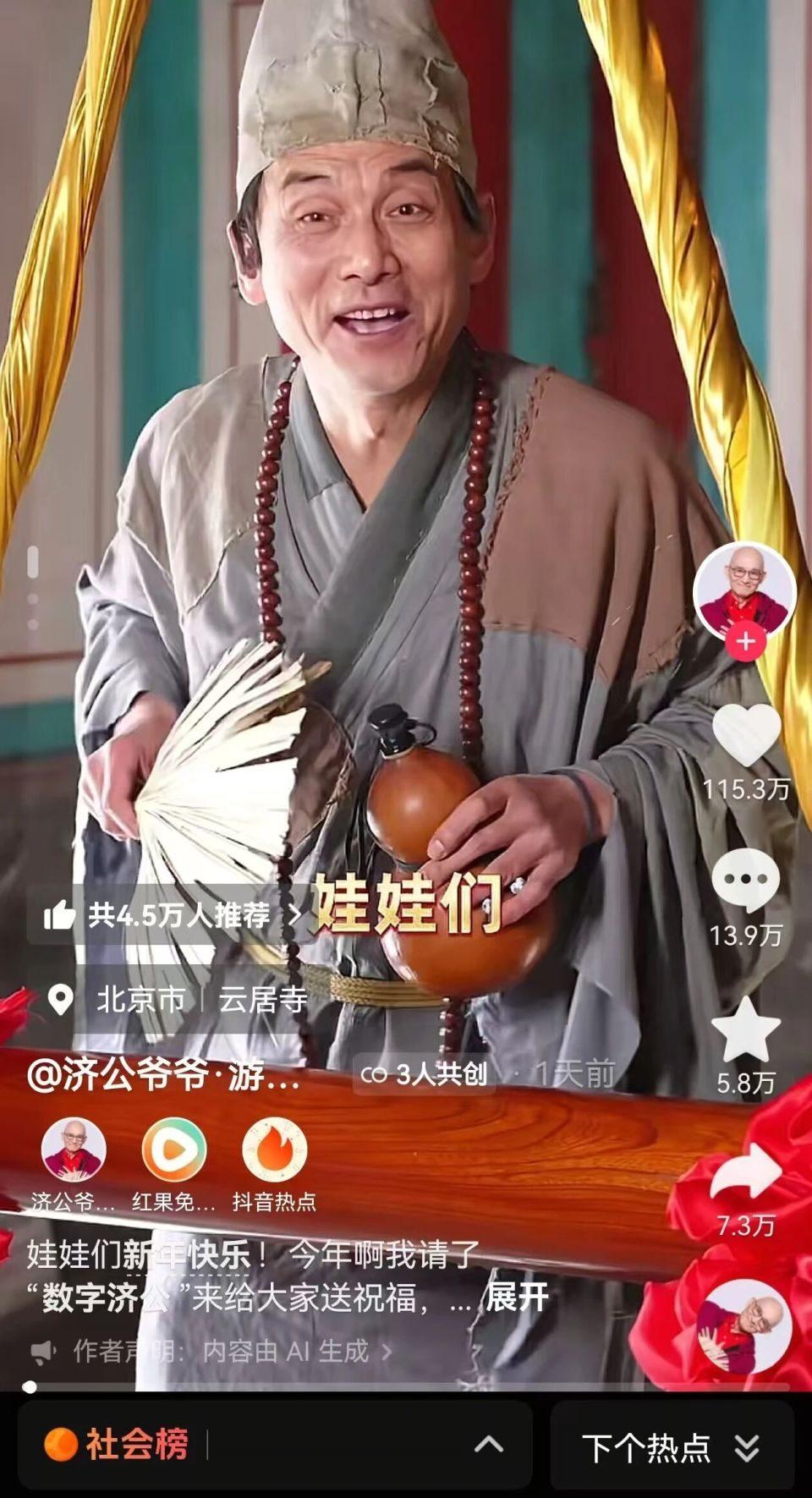前天,“济公”扮演者——92岁的游本昌在社交平台发布了一段“数字济公”送2026祝福的视频,给全国的“娃娃们”送上了福气三连击:
