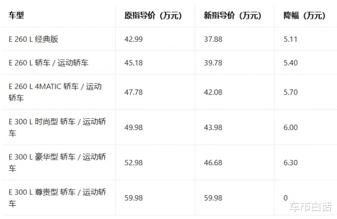 关注BBA的朋友,应该都注意到了,今年以来,奔驰、宝马和奥迪的价格集体下行。以前需要40万以上的“56E”,现在通通下探到30-40万区间,包括价格向来坚挺的奔驰E级也是如此。3月初期,官方就对奔驰E级指导价进行了下调,由42.99-59.98万改为37.88-59.98万。除了顶配,其余版本明面价格都进行了下调,而且终端还有谈价的空间,只是多与少的问题。