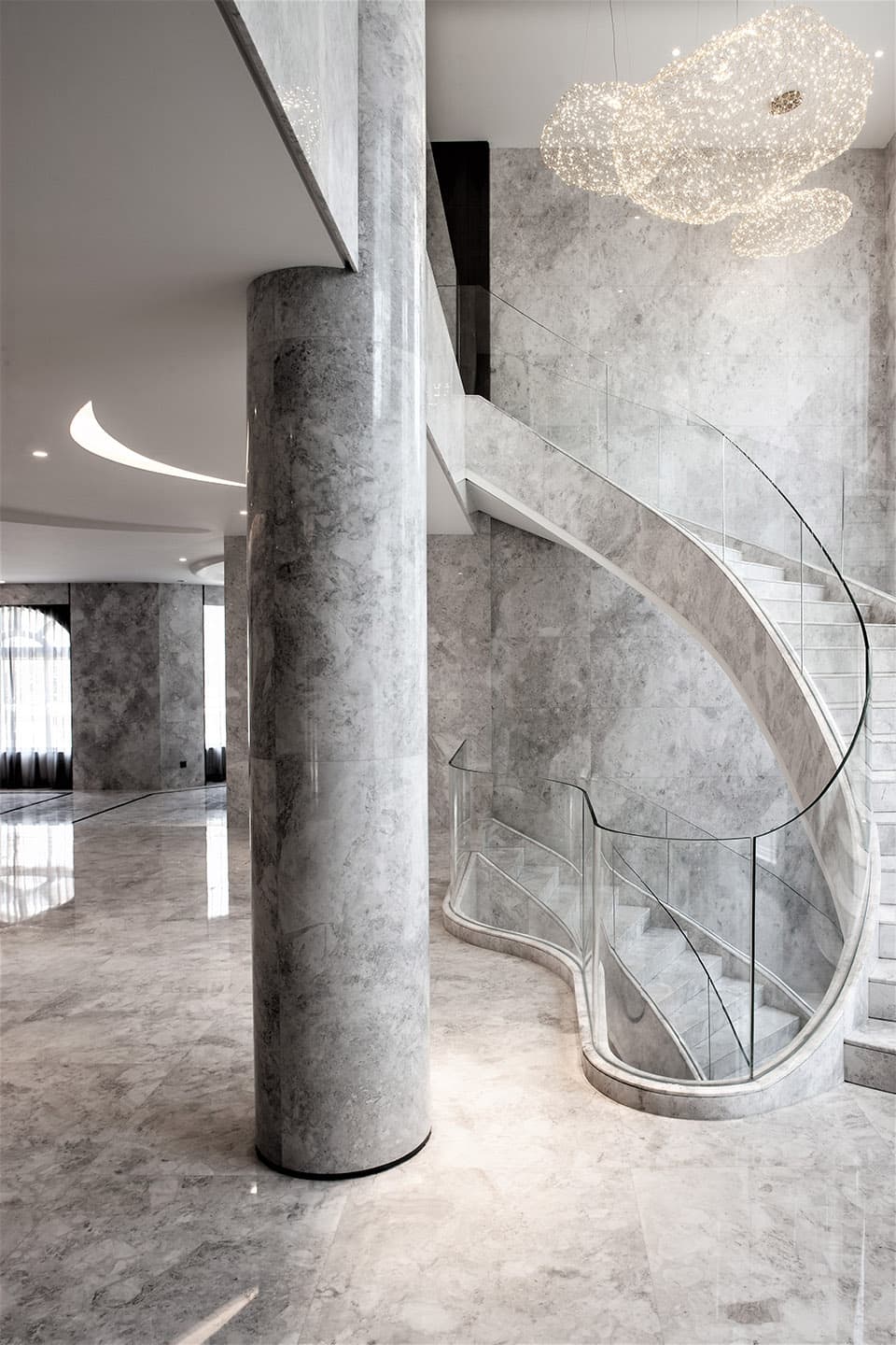 ▷ 整装包含项:基础装修(分层防潮 + 挑空吊顶)+ 主材(意大利卡拉拉岩板 + 德国克诺斯邦板材 + 杜拉维特卫浴)+ 智能系统(Control4 中控)+ 人工(含别墅垃圾清运)