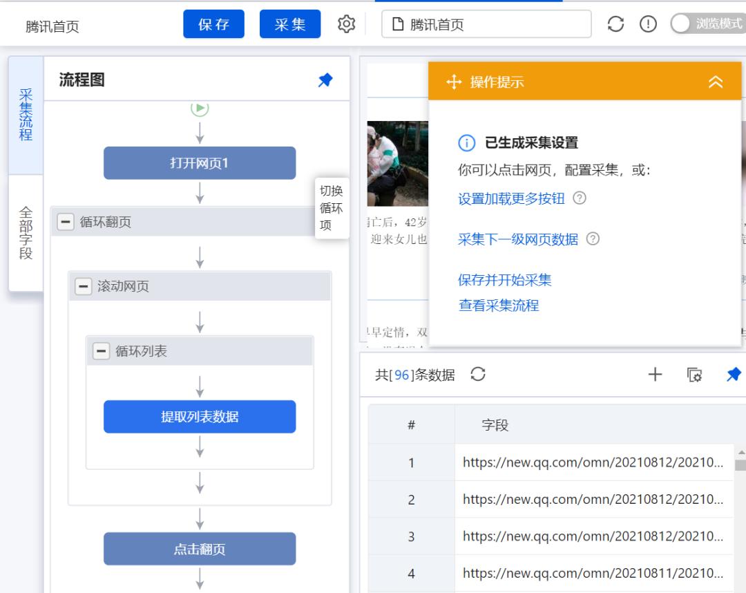 另外它的界面采用了逻辑清晰的流程图设计。每一个操作(如打开网页、循环、点击、提取数据)都被表现为一个可配置的节点 。这种设计不仅降低了门槛,也方便用户进行复杂的逻辑调试。