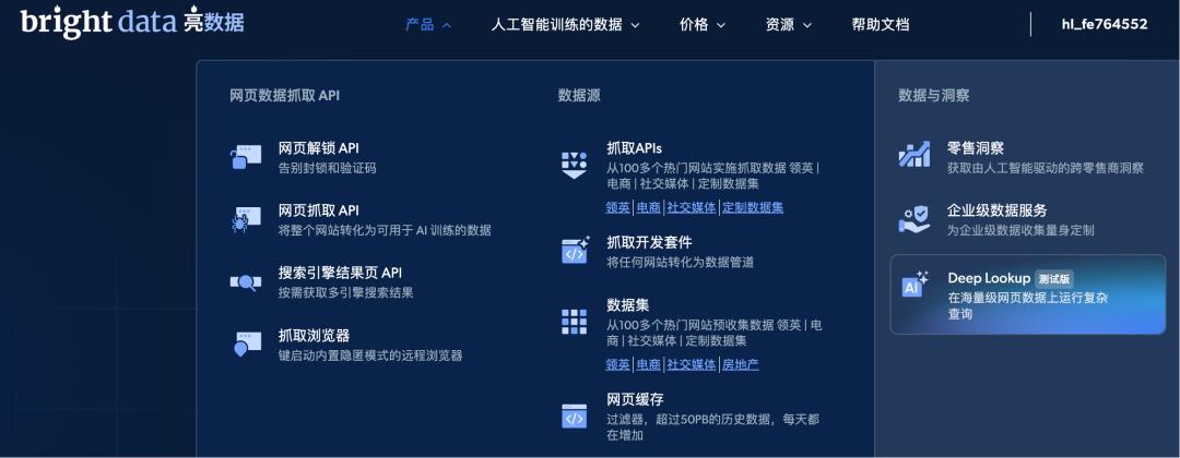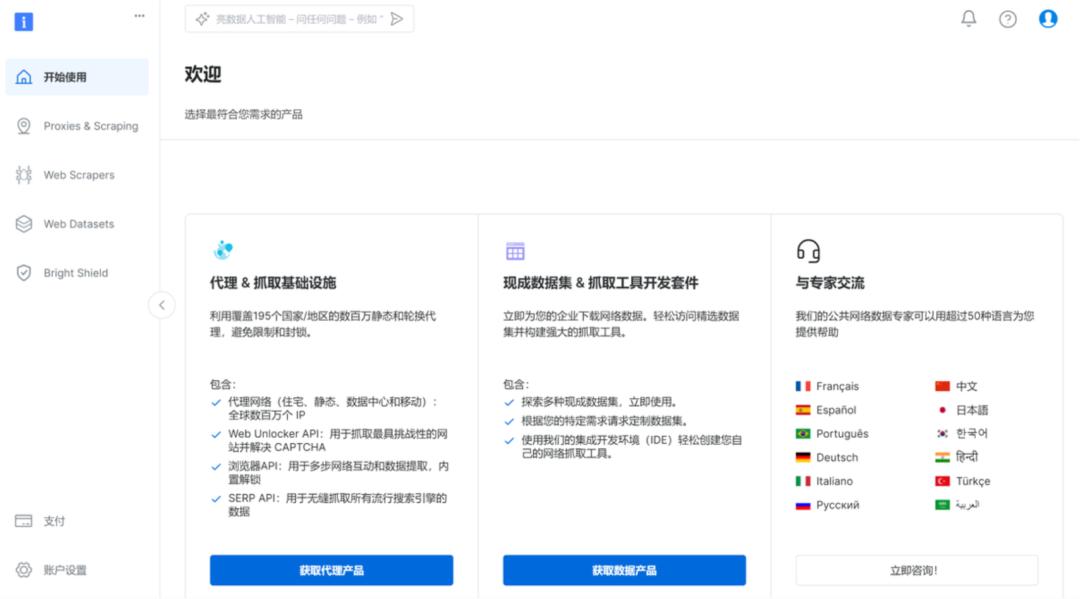 亮数据(Bright Data)亮数据则是专门用来采集复杂网页数据的集成化工具,它有专门的抓取API接口,可以处理各种反爬机制,能直接请求到结构化的数据。