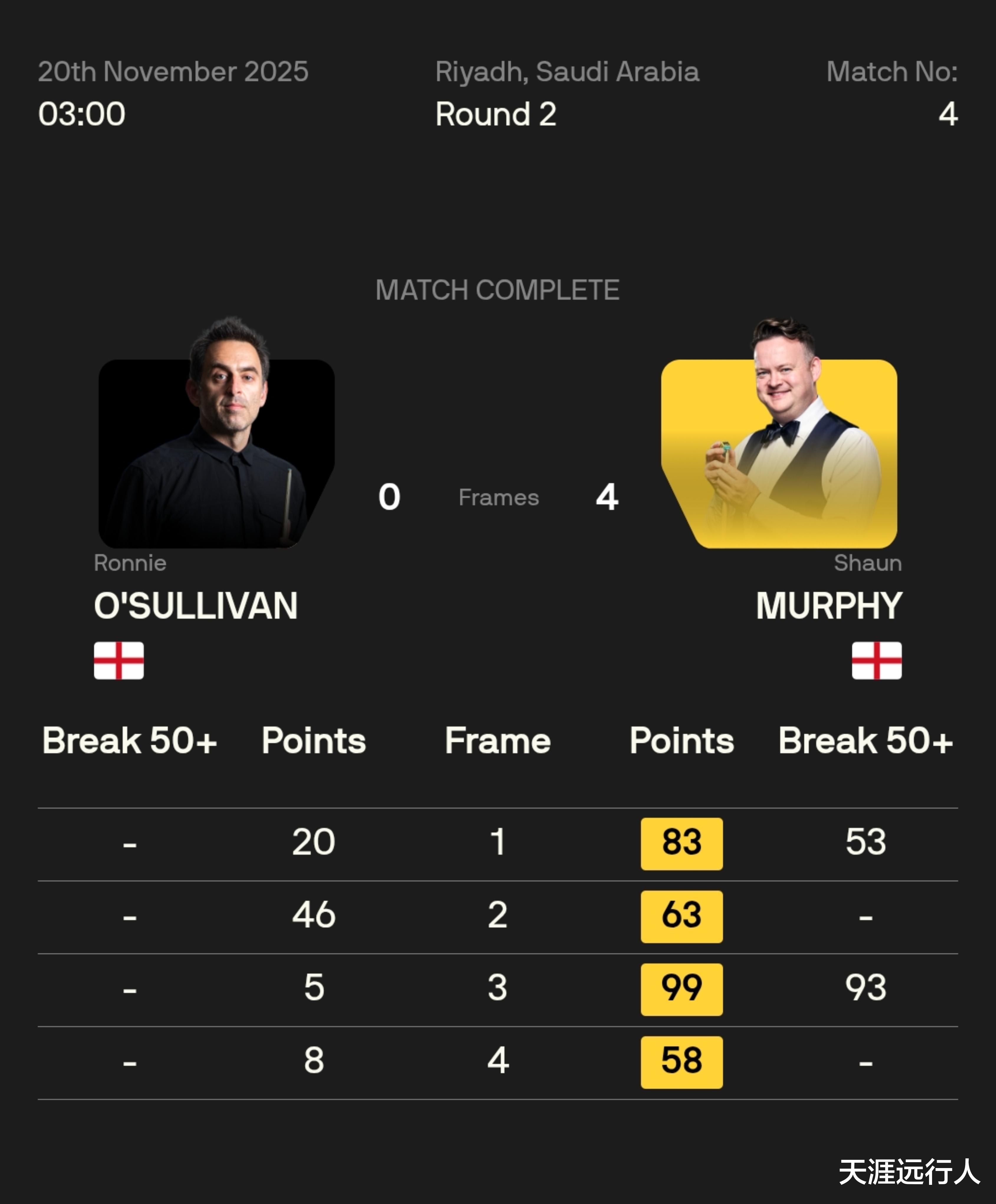 罗尼·奥沙利文 0-4 肖恩·墨菲