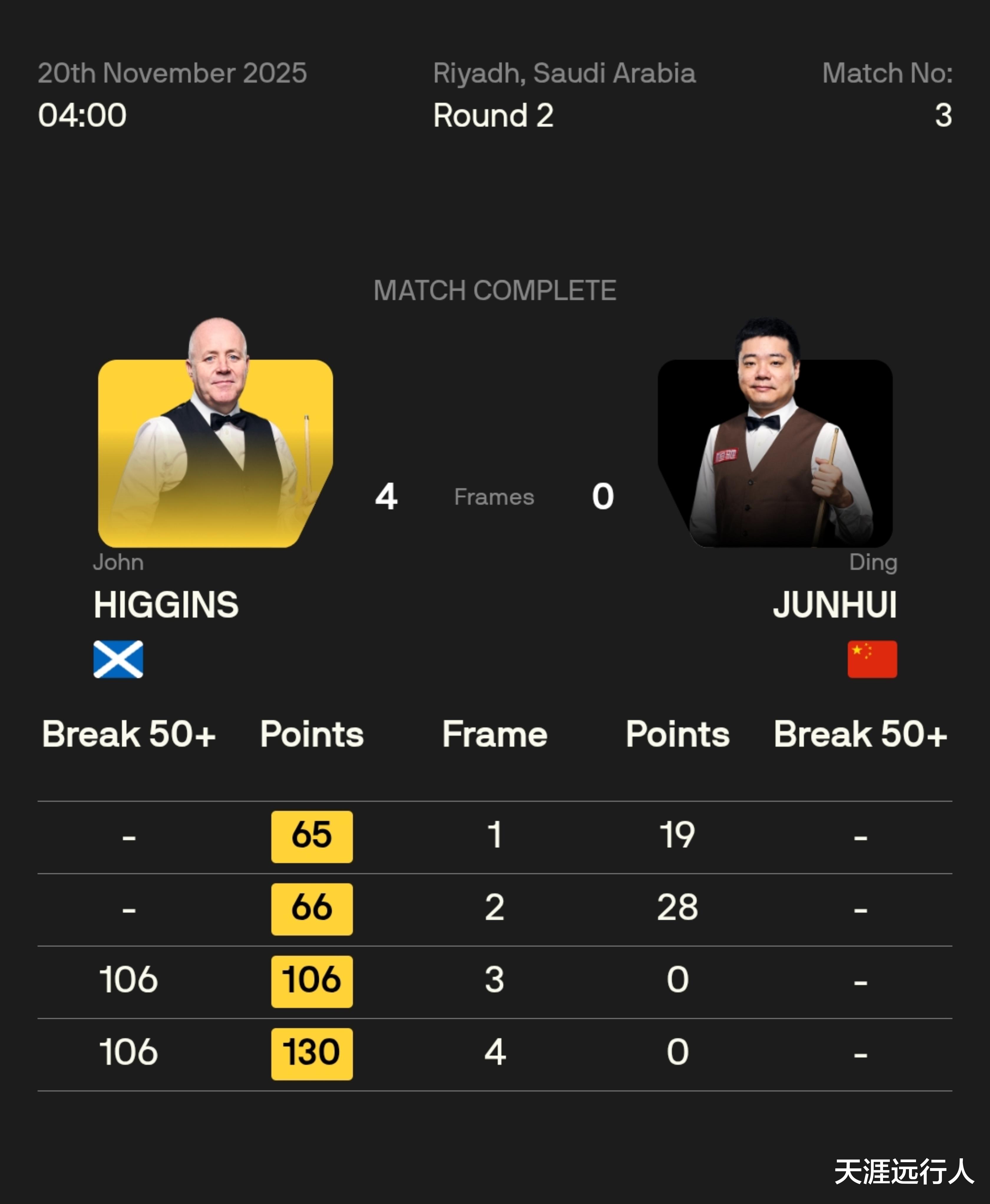 北京时间11月20日凌晨6时23分,2025利雅得狂欢季斯诺克锦标赛首日,12进10和10进8两个轮次的四场比赛,全部决出了胜负。