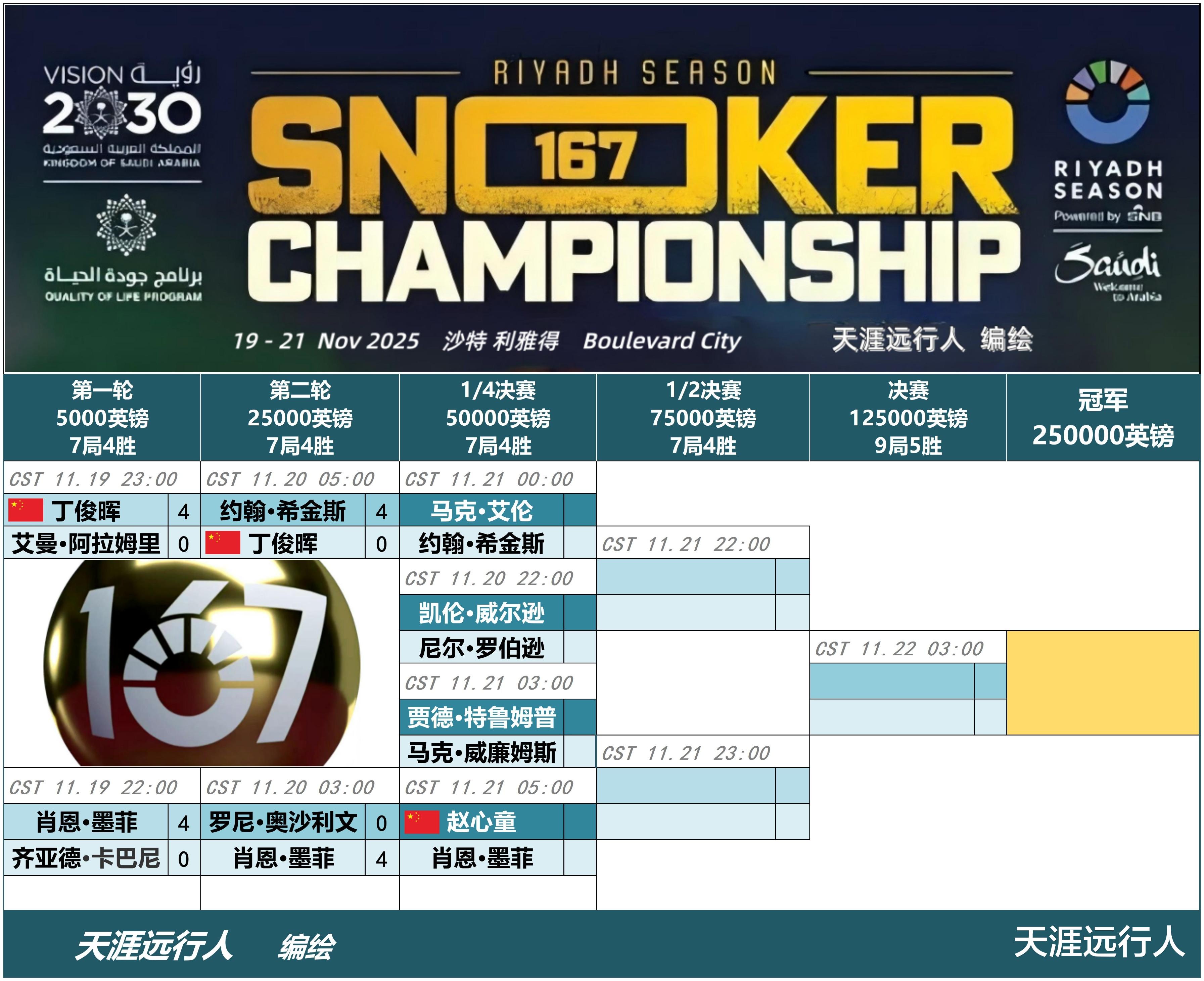 最新即时更新2025利雅得狂欢季斯诺克锦标赛进程签表