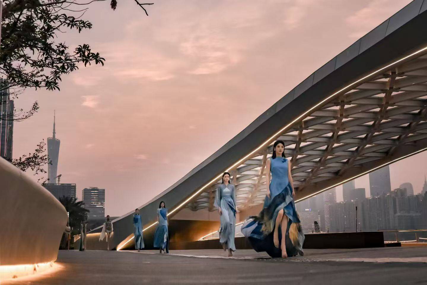 活动现场,在落日晚霞与珠江两岸城市剪影的映衬下,30名专业模特身着海珠区本土培育的原创品牌服饰依次登场,展开一场时尚与城市空间的深度对话。邓兆萍私人定制、生活在左、朵以、纽方、KIMUSSO、ZICKNESS、鬼才创意设计院等多个品牌集中亮相,充分展现了海珠区时尚产业多元共生、协同发展的生态格局。