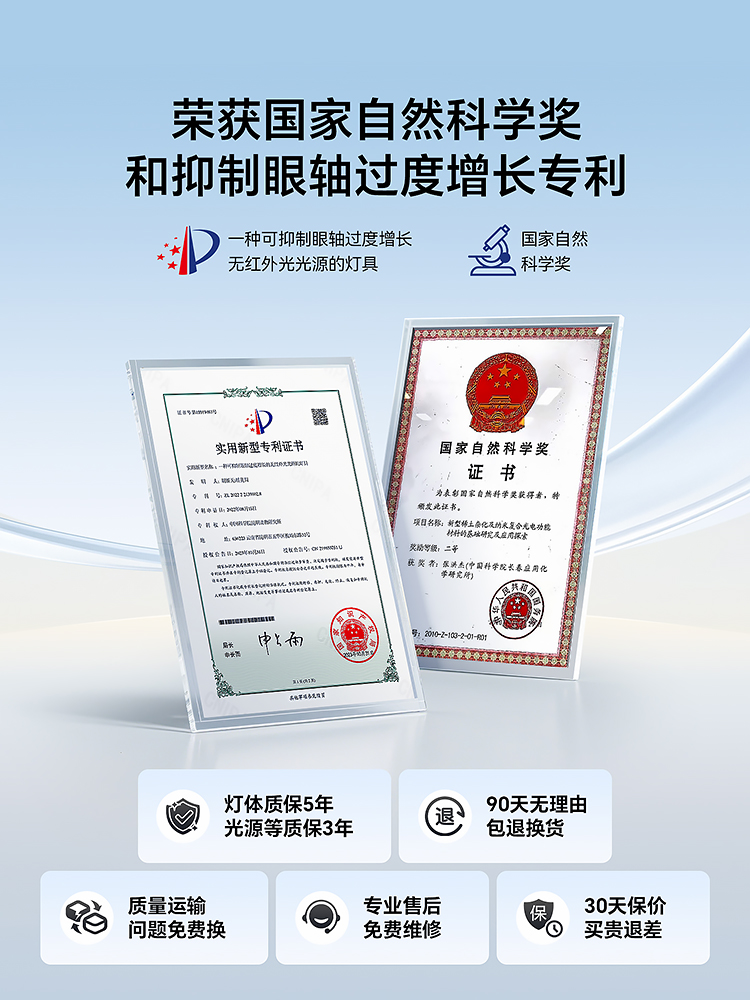 与市面上大多数宣称“护眼”的灯具不同,中科稀土灯珠拥有两项核心发明专利作为“身份证”:“可抑制眼轴过度增长的新型光源及其模拟方法、灯具”(发明专利号:ZL202010055447.4)与“可抑制眼轴过度增长的无红外光光源的灯具”(实用新型专利号:ZL202222139602.8)。这意味着,它的护眼效果不是模糊的概念,而是有明确科学原理和专利技术支撑的精准干预。