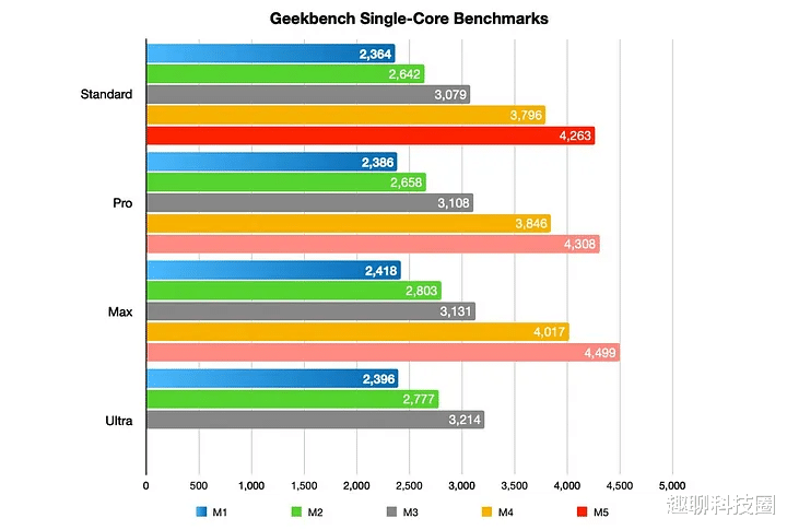 按照过去 M1 到 M4 的套路去拆解,苹果会在保持效率核数量不变的同时,持续增加高性能核的数量,我们可以据此估算未来的性能跃升,注意,这些只是基于规律的推断,不是苹果的官方公告;