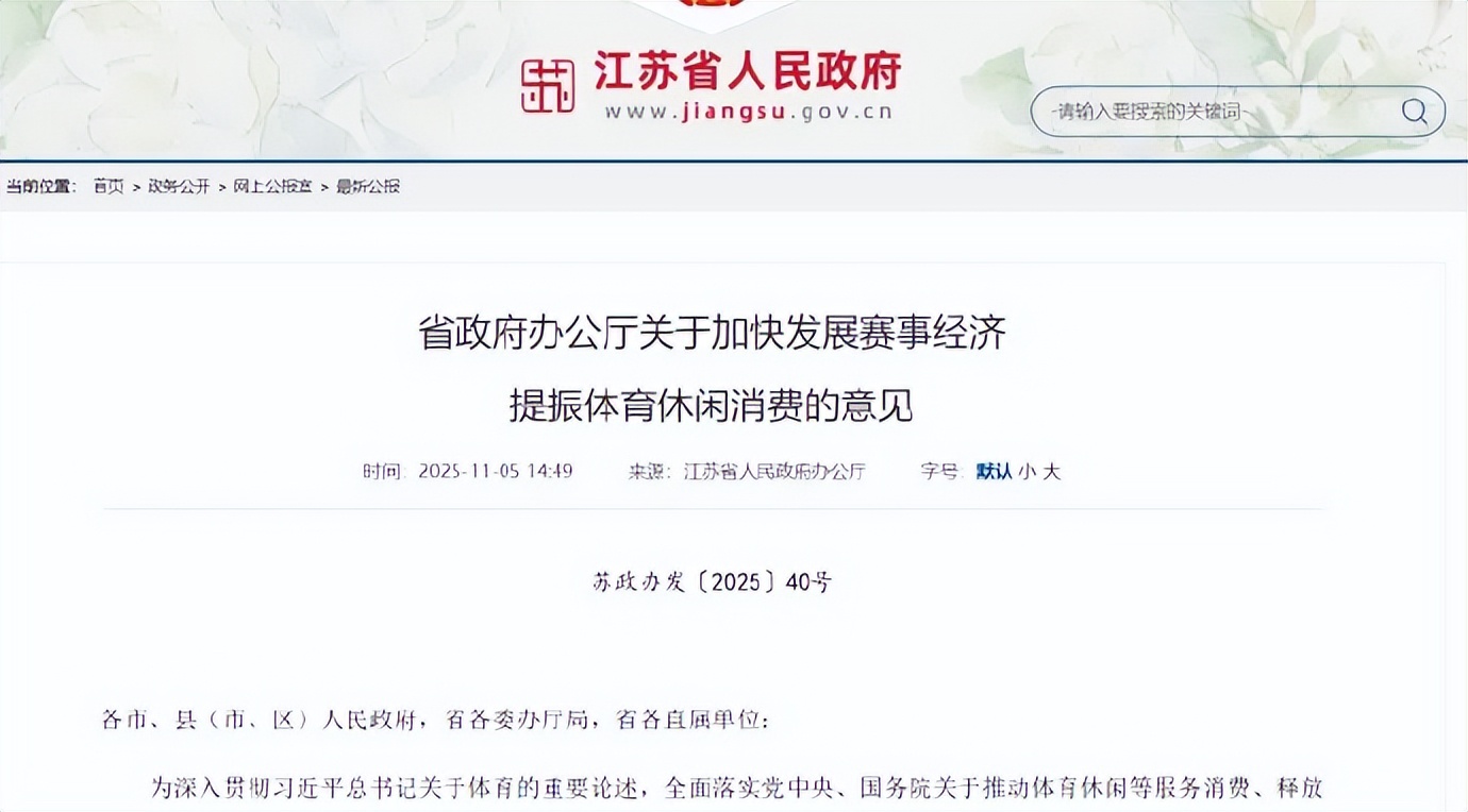 11月5日,江苏省政府办公厅印发实施《关于加快发展赛事经济提振体育休闲消费的意见》。《意见》指出,拓展赛事消费场景,推进