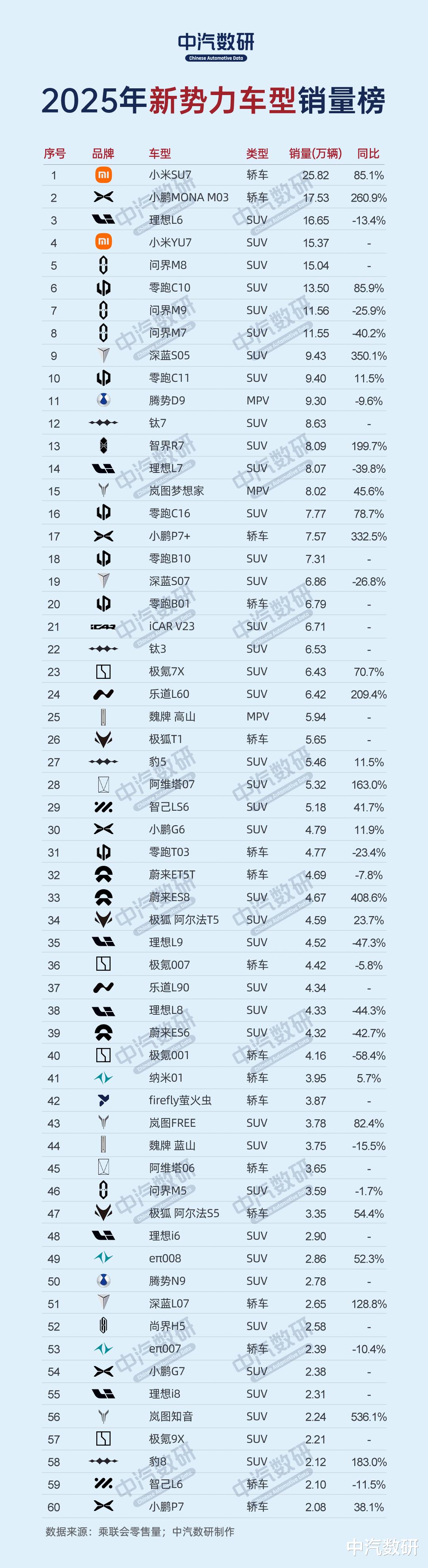 从零售数据来看,2025年新势力销量榜TOP10合计销量145.9万辆,占TOP60总销量的近40%。小米汽车旗下的SU7(25.82万辆)、YU7(15.37万辆)两款车型霸榜整体市场,成为全年最大黑马。其中小米SU7以85.1%的同比增长夺冠;YU7作为年度新车型,上市后便快速跻身中大型SUV市场头部。