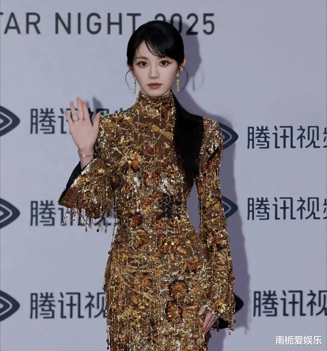在2025年腾讯视频星光大赏的红毯上,田曦薇以一袭Gucci金色流苏长裙惊艳亮相,瞬间点燃全网热议。礼服以低饱和鎏金为底色,缀满重工刺绣与密集珠片,行走间流苏摇曳,光影流动如碎钻银河倾泻而下,视觉冲击力极强。田曦薇以168cm的优越身型驾驭这件“影后裙”,将高级定制的磅礴气场展现得淋漓尽致。