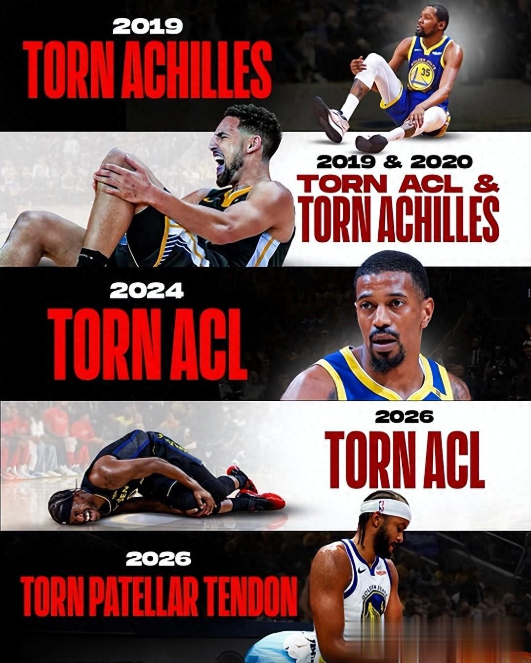 然而,伤病的诅咒像如影随形的幽灵。2024年梅尔顿的受伤让勇士失去了最理想的防守拼图;2025年库里腿筋的反复,预示着即便是神也无法对抗自然的规律。到了2026年,当管理层孤注一掷地交易来吉米·巴特勒,试图用铁血对抗宿命时,现实又给了金州最沉重的一击:巴特勒与摩西·穆迪相继遭遇毁灭性膝伤。