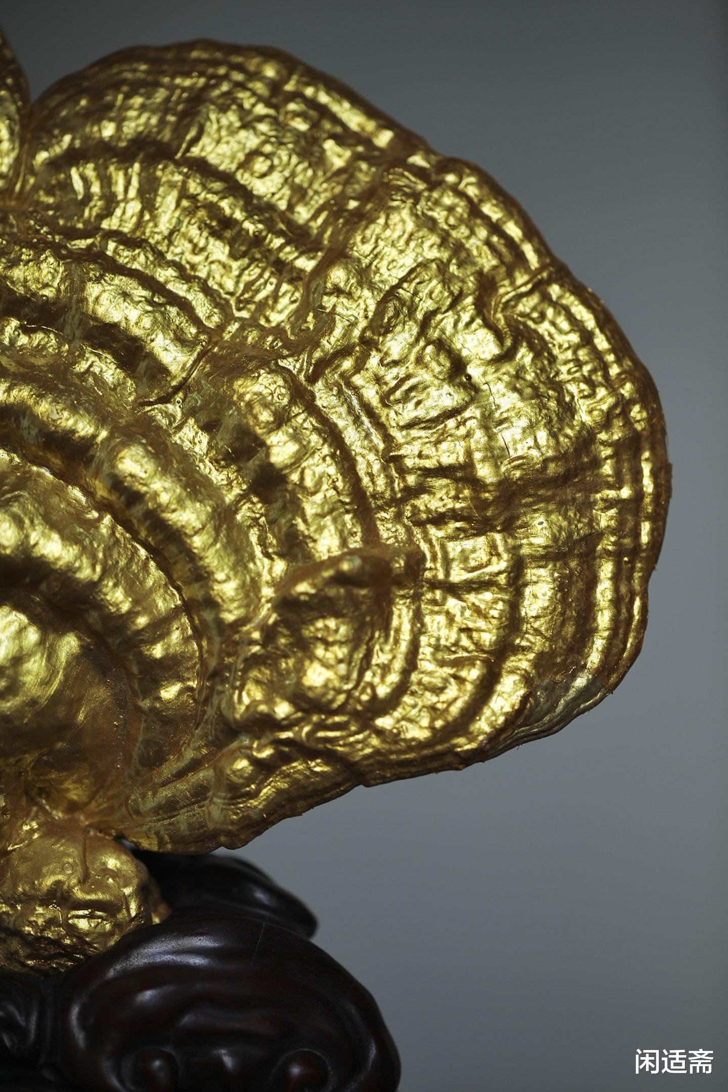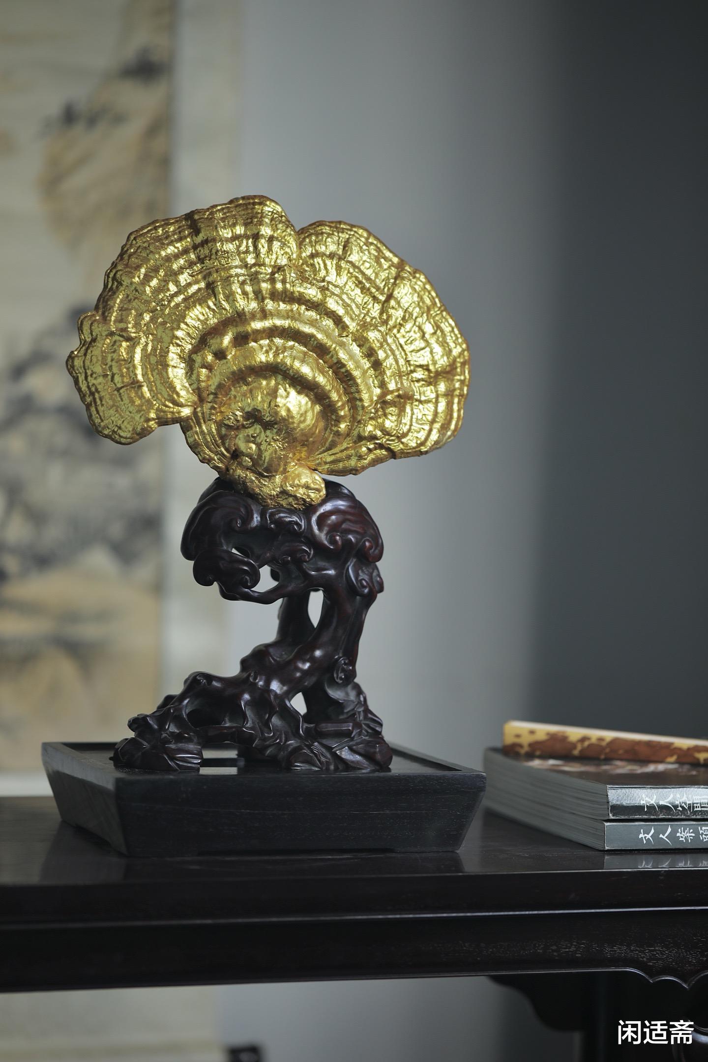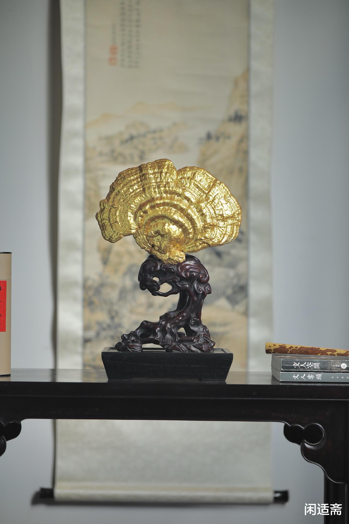 灵芝表面采用传统髹金工艺,色泽莹润华贵,光泽柔和不张扬,既凸显了灵芝的灵秀形态,又增添了摆件的高端质感,将传统工艺的精湛与细腻展现得淋漓尽致。髹金的璀璨与灵芝的天然肌理相融,刚柔并济,既有自然的质朴,又有工艺的奢美,尽显东方陈设的雅致格调。