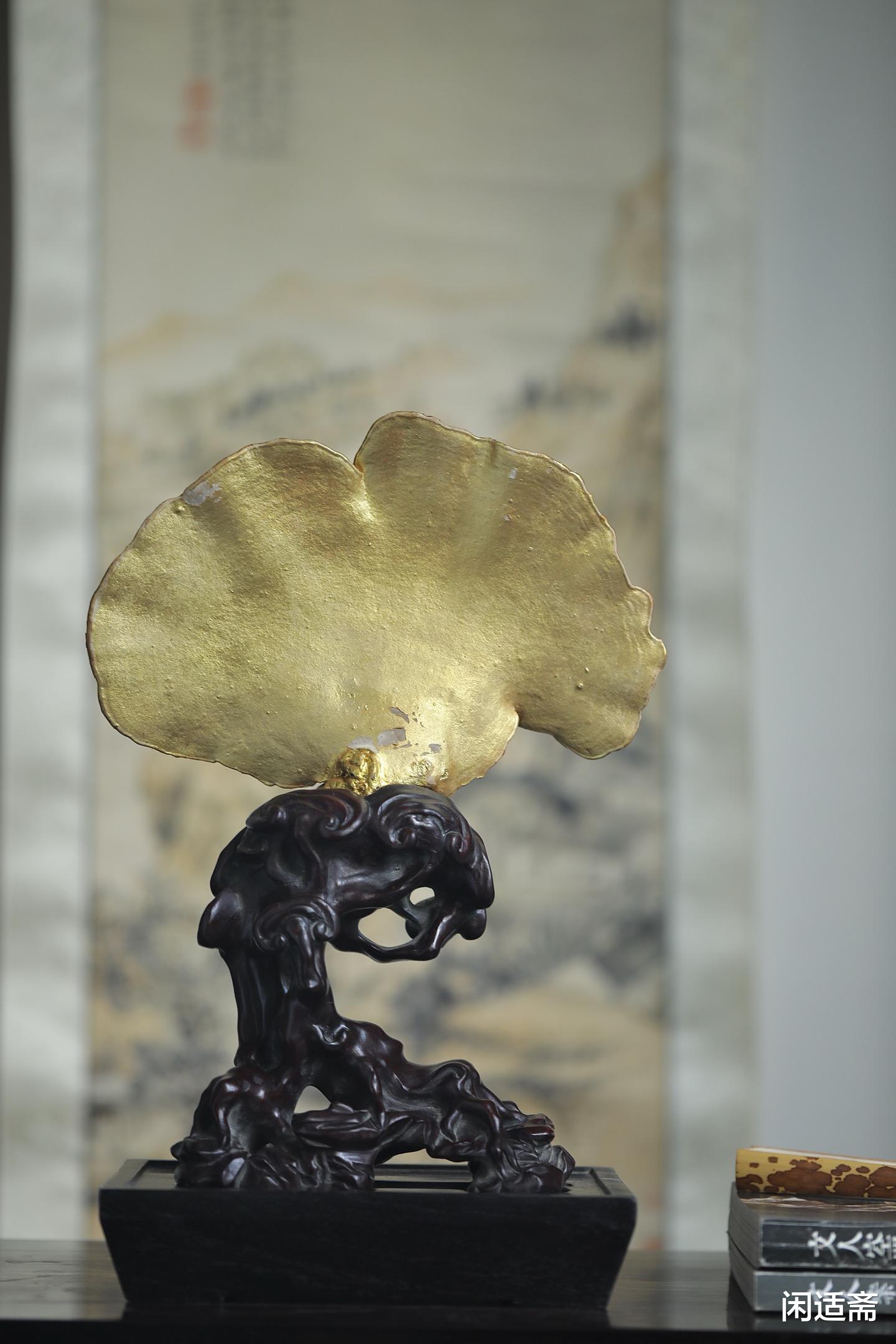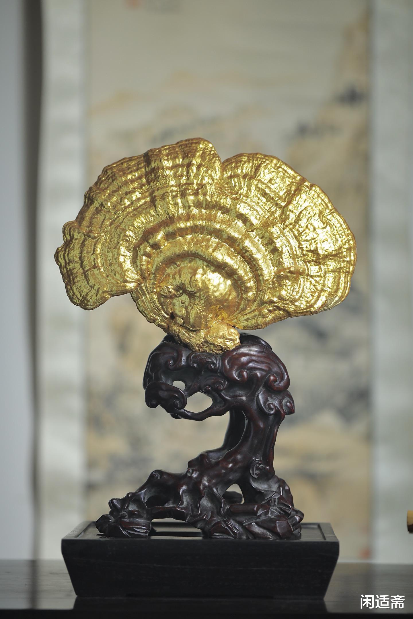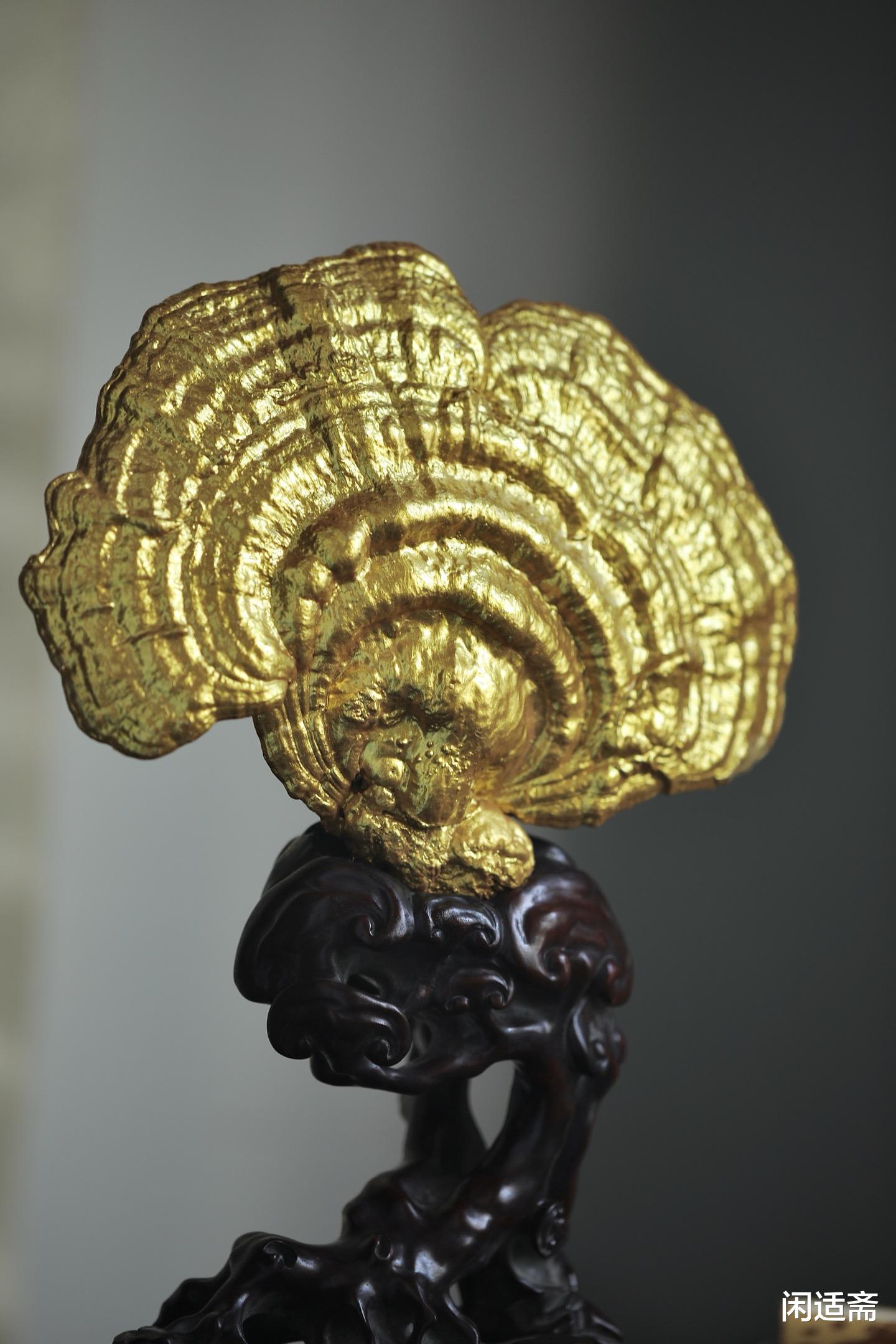 灵芝表面采用传统髹金工艺,色泽莹润华贵,光泽柔和不张扬,既凸显了灵芝的灵秀形态,又增添了摆件的高端质感,将传统工艺的精湛与细腻展现得淋漓尽致。髹金的璀璨与灵芝的天然肌理相融,刚柔并济,既有自然的质朴,又有工艺的奢美,尽显东方陈设的雅致格调。