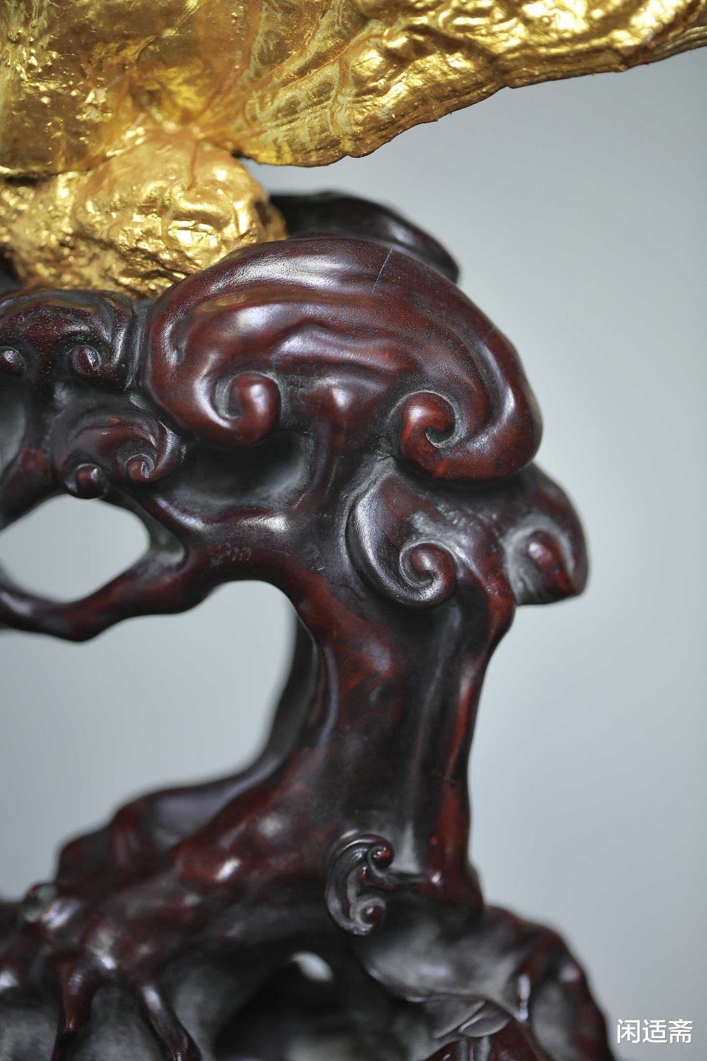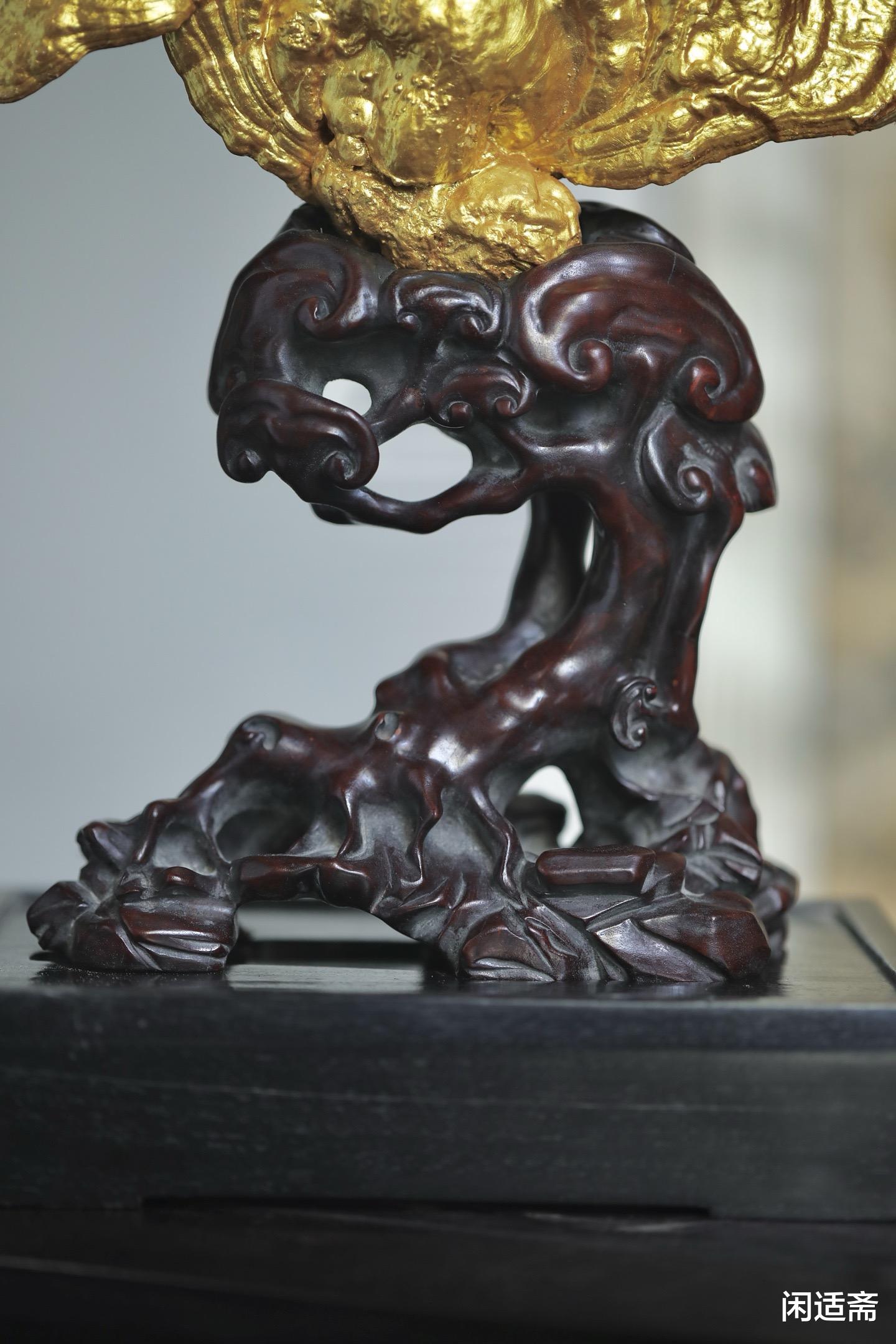 搭配造型古雅的红木底座,木质温润厚重,纹理细腻舒展,与髹金灵芝形成巧妙呼应,既稳固了摆件,又为整体增添了古朴韵味,让摆件的气韵更显沉稳内敛。红木的温润与髹金的华贵、灵芝的灵秀相得益彰,三重质感碰撞,尽显陈设雅器的高端格调。