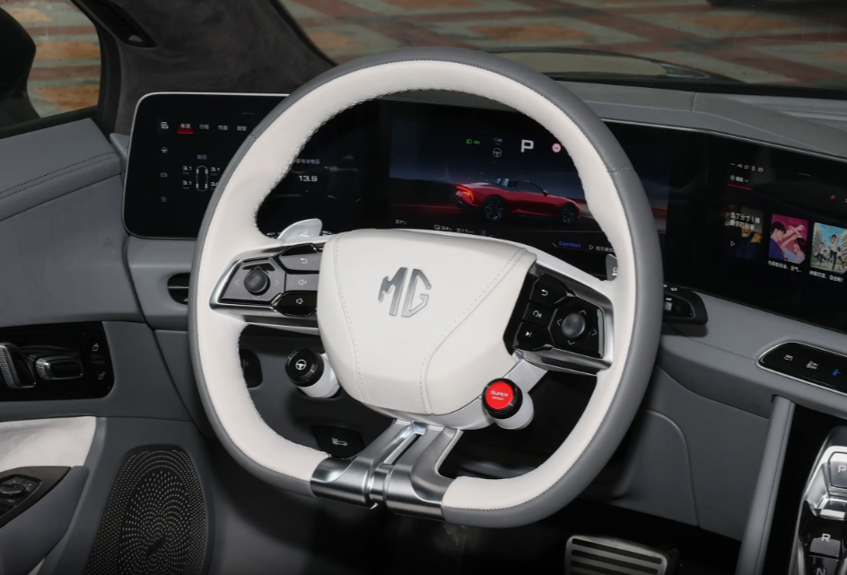 深踩电门,澎湃动力输出瞬间袭来,尤其是开着敞篷听着风声的呼啸,这不就是自由奔放的感觉么。除了常规三种驾驶模式,新款名爵MG Cyberster还配备一个超级运动模式,方向盘右侧有一个红色按键,按下按键的瞬间,仪表盘UI布局便发生变化,开启弹射模式相当有驾驶乐趣,得益于小巧的车身姿态,操控起来十分灵活。