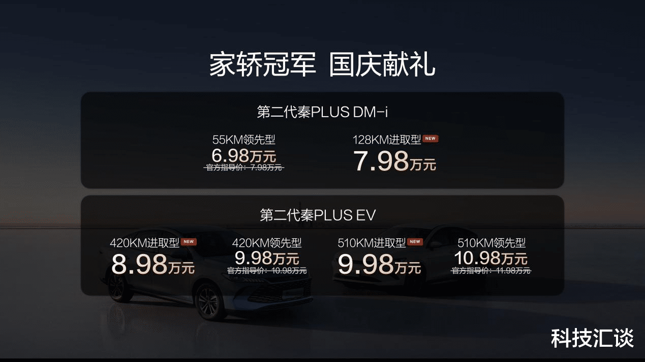 比亚迪在国庆前夕(9月25日)推出第二代秦PLUS三款进取型新车,包含DM-i插混与纯电版本,限时起售价6.98万元。作为累计销量突破150万辆的A级家轿冠军,新推出的第二代秦PLUS DM-i 128KM进取型将纯电续航提升至128公里,配合2.69L/100km的NEDC亏电油耗,印证了其作为节能省油全球王者典范的技术实力。纯电版本提供420KM和510KM两种续航选择,而且秦PLUS EV的续航达成率非常高,“刀片电池+八合一电驱总成”组成黄金搭档,再加上宽温域热泵系统,能在零下30℃到零上40℃的温度里工作,大幅提升冬季续航能力。该系列标配NFC钥匙、VTOL移动电站等实用配置,在智能泊车方面,新增车头泊入车尾泊出、窄车位自动收后视镜、偏置泊车等功能。值得注意的是,全系新增星河米车色和怀挡设计,在保持价格优势的同时提升产品质感。此次价格下探至6万元区间,秦PLUS或将进一步巩固其在家庭轿车市场的领先地位。