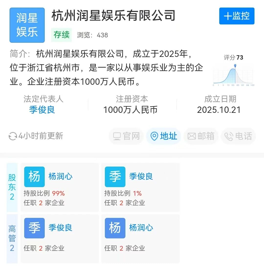 除了开设新账号,蛋蛋还在10月21日和22日接连注册成立了两家新公司——杭州润星娱乐有限公司与杭州润心娱乐有限公司,注册资本均为1000万元。天眼查信息显示,这两家公司均由蛋蛋(本名杨润心)持股99%并担任监事,另一股东季俊良持股1%,同时出任法定代表人、经理及董事等职务。