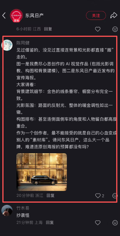 原创作者找上门后,东风日产连夜悄悄换了海报,随后又直接秒删,这波变相认怂,很难不让人多想。