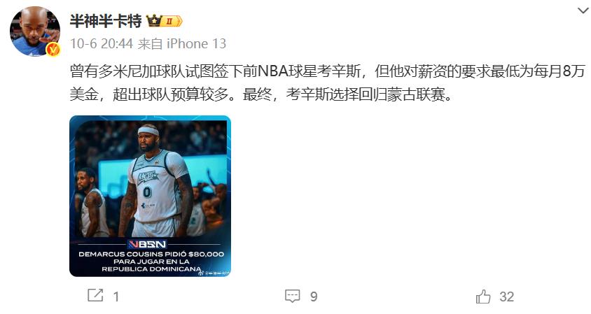 据国内媒体人“半身半卡特”的了解,曾有多米尼加球队试图签下前NBA球星考辛斯,但是考辛斯方面对于薪资的要求最低为每月8万美元,该8万美元为到手的实际薪资。由于超出球队预算太多,最终,考辛斯选择回归蒙古联赛。