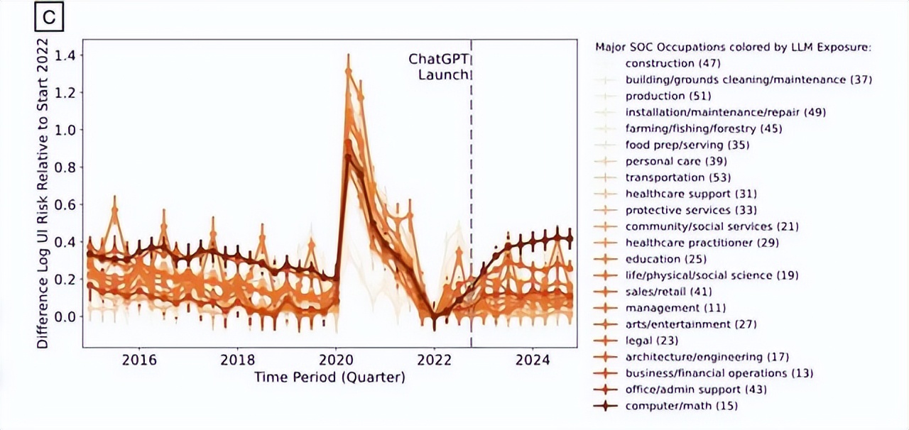 计算机、商务、金融等高AI暴露率的职业,其失业风险在2022上半年已远超餐饮与建筑业。