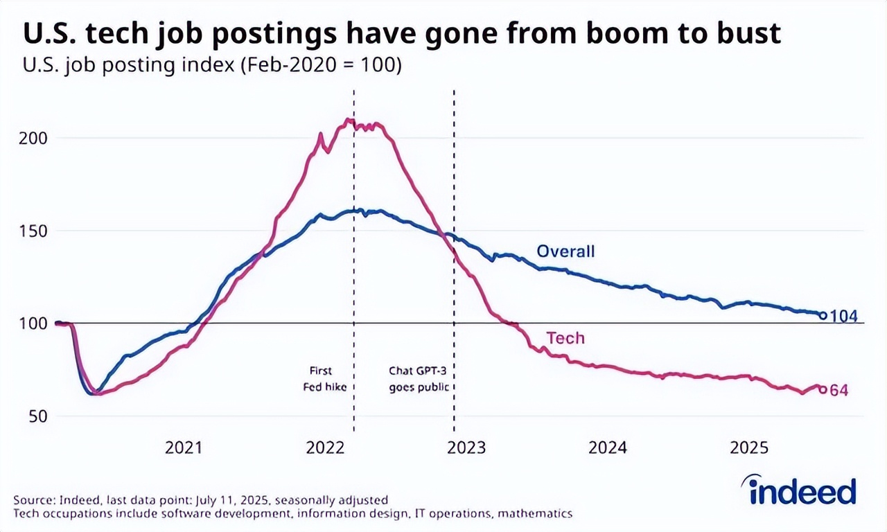 科技职位信息在 2022 年初之前后翻了一倍以上,但此后已全部回撤,截至 2025 年 7 月 11 日,较疫情前水平低 36%。