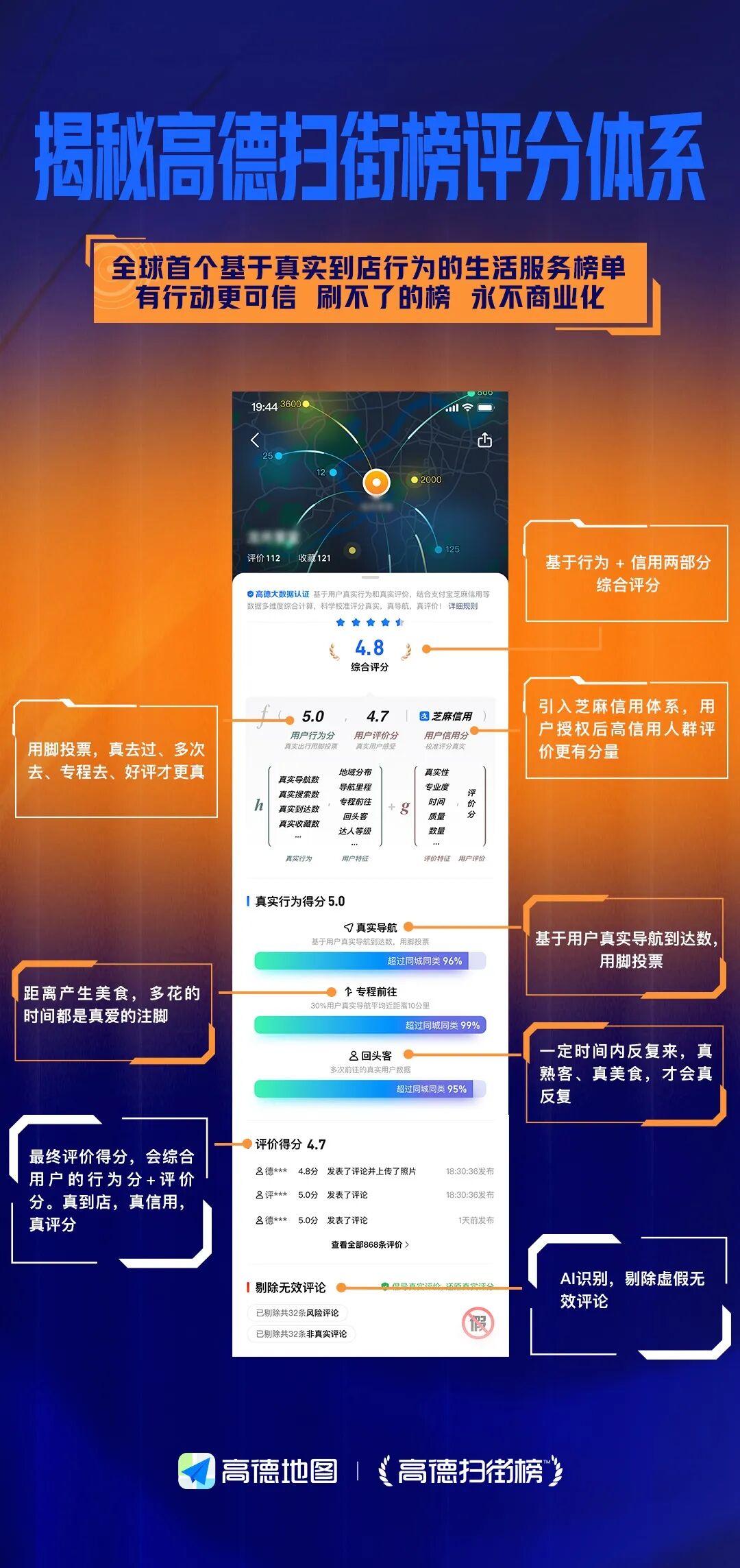 这是一个从技术到理念的“全新物种”,其核心逻辑在于:将导航、到店、复购、专程前往等行为数据纳入评价体系,并引入芝麻信用和AI,决定一家店铺能否上榜,而不再是依赖评论、晒图或星级。
