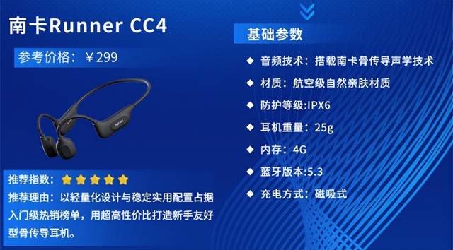 推荐理由:作为骨传导行业的标杆品牌,南卡将旗舰技术全面下放,打造出这款专为大众用户设计的Runner CC4。凭借极致轻盈、稳定音质与可靠防水,在200—300元价位段实现全面领先,是学生党、通勤族与轻度运动爱好者的高性价比首选。