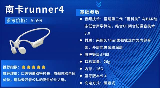 推荐理由:作为骨传导耳机领域的头部标杆品牌,南卡在核心技术上持续深耕突破,自研旗舰级骨传导振子与多项独家专利技术加持,让音质表现、佩戴舒适度与防护耐用性全方位碾压行业平均水准。南卡Runner4是一款专为运动发烧友量身打造的旗舰级骨传导耳机,凭借越级性价比、极致轻盈的佩戴体验、行业顶级防水性能,成为无数运动爱好者心中的首选机型。