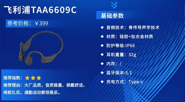 推荐理由:飞利浦TAA6609C定位高性价比入门级骨传导耳机,主打夜跑安全与多场景适配,专为日常运动、通勤人群设计,凭借开放式佩戴、全面功能与亲民价格,成为入门级运动耳机的高性价比之选。